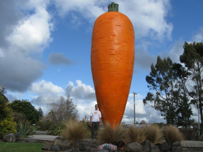 Okay, since I was talking about motivation (and the carrot and the stick) in my Fat Chick Sings Blog, I thought I’d research the world’s largest carrot. Unfortunately the world’s largest real carrot weighs only about 8 pounds. And while 8 pounds is REALLY big for a carrot, it decidedly weighs less than me. However, in my research I came across this giant carrot sculpture in Ohakune, NZ. It recently celebrated it’s 20th anniversary in the town. The carrot although controversial when installed (some of the townspeople felt it was too, um, phallic) is now beloved by the town which now hosts an annual carrot festival. Precise weight statistics are not available, but this thing is over 30 feet tall! So I did some research regarding the weight of resin fiberglass sculptures based on square footage and thickness and blah, blah, blah. and after detailed calculations I came up with, um LOTS! It’s just a guess, but I’m going with it.