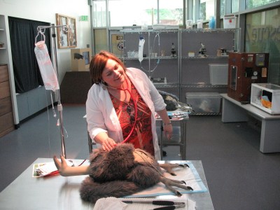 That’s why I’m so glad on day 2 of our fabulous stay at home vacation we went to the zoo and played like big, goofy, overgrown kids. That’s a picture of me at the Condor experience, playing “doctor” with a stuffed, trussed, pretend condor. The coat was not designed for grown-ups (especially a big girl like me) but I managed to don it long enough for the hubby to get the snap.