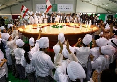 Well along with the decades-long argument between Lebanese and Israelis about where hummus originated, we also have a battle for who can make the biggest hummus plate. The Israeli’s launched the opening initiaitve in May of 2008–creating a giant 4 meter (4.35) yard plate containing 881 pounds of hummus. (The Israeli’s love hummus with the average, per capita consumption hovering at about 22 pounds.) But the Lebanese battled back in October of 2009 creating what is now considered the world’s largest plate of hummus. Here’s the stats: