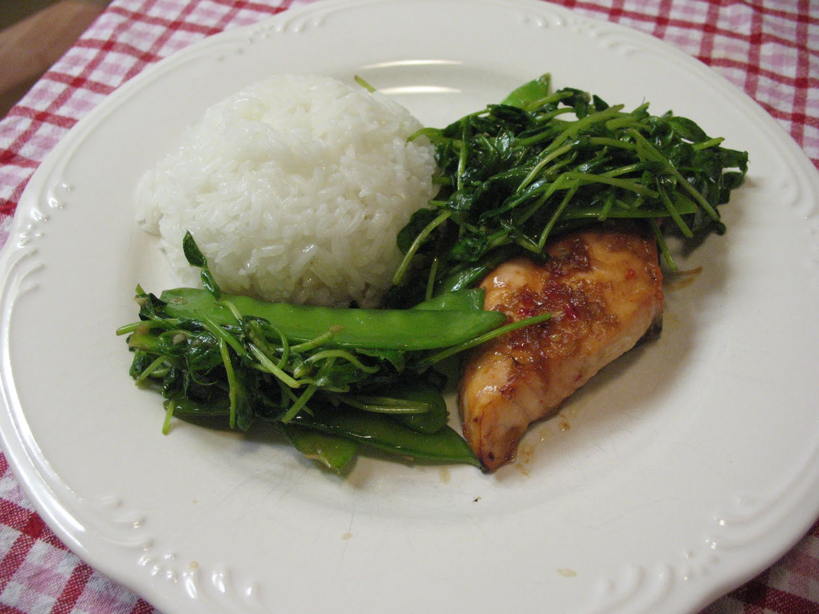 Salmon with Sweet Chili Glaze, Sugar Snap Peas, and Pea Shoots