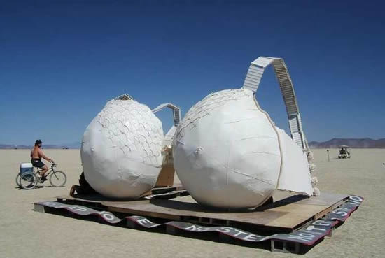 This is a bra sculpture, apparently seen at Burning Man. I actually have very little information about it other than the obvious–it’s big. I mean REALLY big. This thing gives new meaning to the slang over the shoulder boulder holders.
