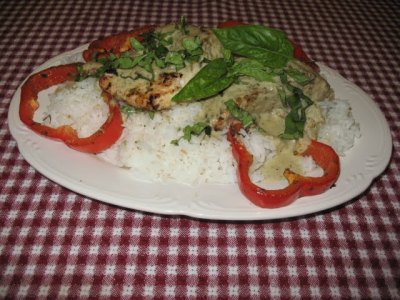 Put the curry simmer sauce in a food processor with half of the fresh basil leaves. Process until the leaves are very finely minced and mixed with the sauce. Pour the sauce into a 1 qt. saucepan and simmer for 10 to 15 minutes on low. Cut the pieces into 4 or 5 ounce servings. Dip the fish and the red pepper rings in the coconut/curry mixture. Heat grill to medium high. Grill fish on the center (hottest) part of the grill and the red peppers on the outside for 5 minutes until the red pepper rings are beginning to brown and the fish is cooked through. Put the rice on a large platter. Put the fish fillets and pepper rings over the rice. Cover with the green curry mixture and sprinkle with fresh basil leaves. Serve immediately with a crisp Asian-style beer like Singha. Serves 4.