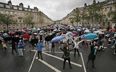 The autumn rains have arrived in LA and I think it’s fair to say that I have rain on the brain. So in my ongoing search for stuff that weighs more than me, I found this little gem–the world’s largest umbrella dance group. This large crew of folks in Bath (giggle) Somerset England all came out in the rain to dance to “Singin’ in the Rain”. Apparently the group prepared for over six months before their big debut at the Bath International Dance Festival. It looks like so much fun! Check out the video below: