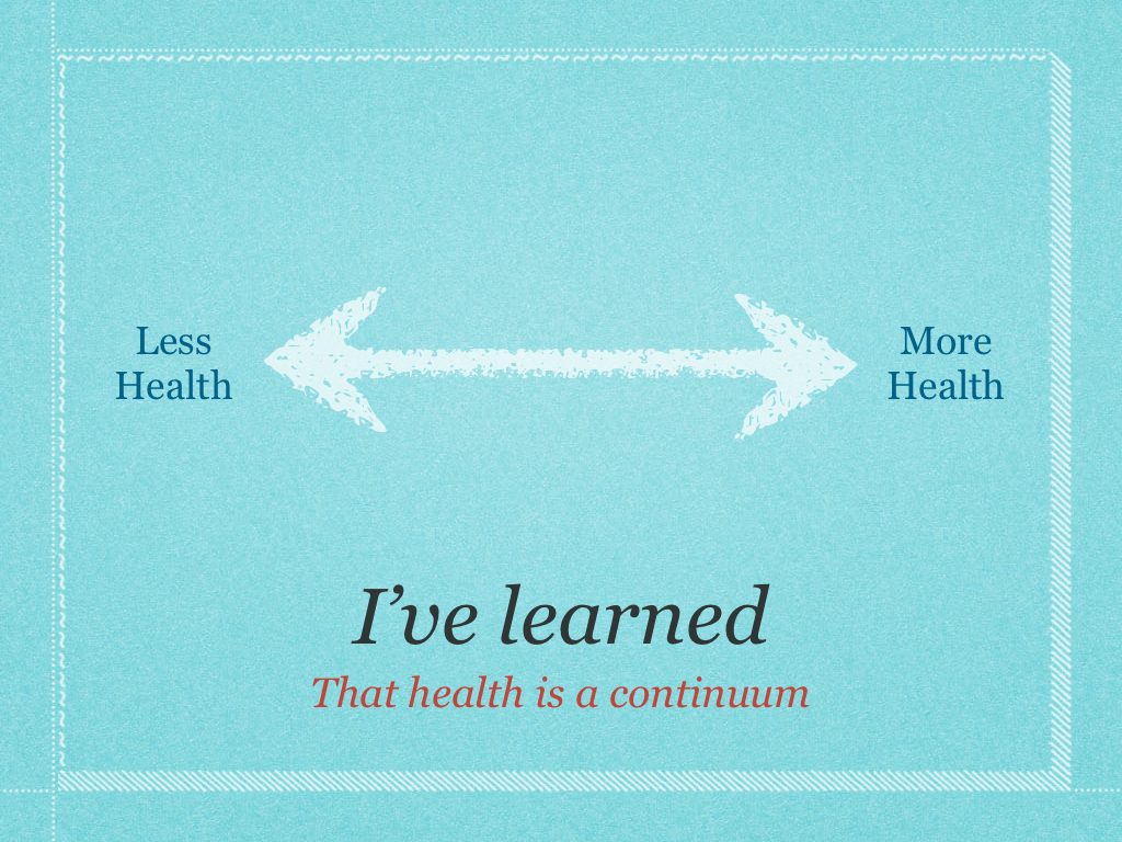 You know it’s funny, in a physician heal thyself sort of way, how I gave this talk the day before I found myself tossed violently to a very different spot on my own continuum.  As I woke up, dazed and in pain, I looked around.  Oh, so I’m here now?  This is my spot on the spectrum today?  Okay.  I’ll just have to see what I can do.  Maybe tomorrow.  After I take a pain killer and watch some telly and gather my forces.  It has made all of this a lot easier to bear.  And I offer this in the hopes that it will be a useful visualization tool for you as well.  Or not.  Because we’re all different.  And just as there is no place called health, there is no single immutable path towards wellness either.  There’s just all of us, muddling along in our own way, as best we can.