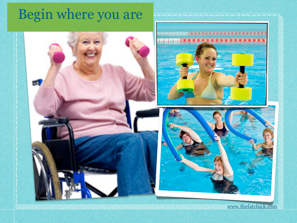 This is particularly important in my work as a fitness instructor.  I work with many people who are coping with many levels of physical challenges.  From joint difficulties, to disease, to chronic pain conditions to plain old aging, many of my students and readers find it difficult to identify themselves as “healthy” as it is commonly understood.  And for many of my students, the notion of “perfect health” seems so remote that it might as well be another planet.  And this distance from the notion of “perfectly healthy” can be extremely demoralizing.  “How can I even start?” or “Why bother?” they ask.