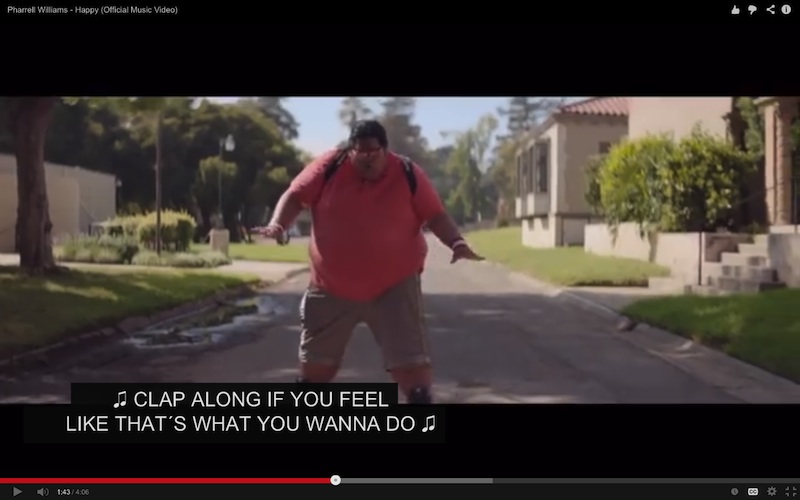 Honestly, this music video is what got me on this whole subject with you in the first place. First of all, I have to apologize. This great song is likely to leave you with an earworm that lasts for days. Sorry about that. But on the upside here we have a video with lots and lots of people who are boogying down and singing about being happy. And remarkably none of these people look the same. There are kids, young people, middle aged people and old people. There are men and women. There are single people and families. There are people who are extremely mobile and some who are less mobile. There are people of all different colors. There are thin people, fat people and in-betweenies. They all look happy as hell, and there is not one single carton of yogurt or salad in the entire music video!